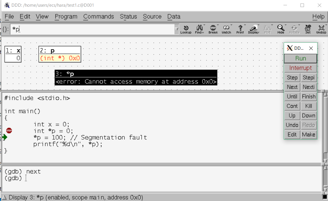 gcc -g -O0 によるコンパイルを行い,その実行ファイルを ddd コマンド経由で実行する.